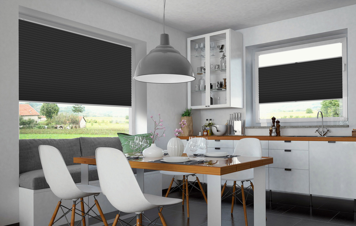 Mit Plissees können Sie jeden beliebigen Teil des Fensters sowohl von oben als auch von unten abdecken. Sehr praktisch, wenn sich der Lauf der Sonne tagsüber ändert oder Sie sich vor neugierigen Blicken schützen wollen. Im hochgezogenen Zustand nehmen Plissees kaum Platz im Fenster ein, sodass Sie bei Bedarf viel Sonnenlicht in Ihre Räume lassen können.