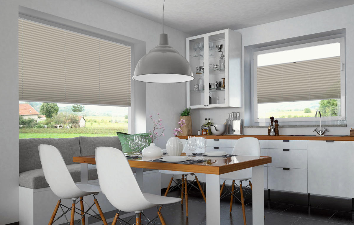 Mit Plissees können Sie jeden beliebigen Teil des Fensters sowohl von oben als auch von unten abdecken. Sehr praktisch, wenn sich der Lauf der Sonne tagsüber ändert oder Sie sich vor neugierigen Blicken schützen wollen. Im hochgezogenen Zustand nehmen Plissees kaum Platz im Fenster ein, sodass Sie bei Bedarf viel Sonnenlicht in Ihre Räume lassen können.