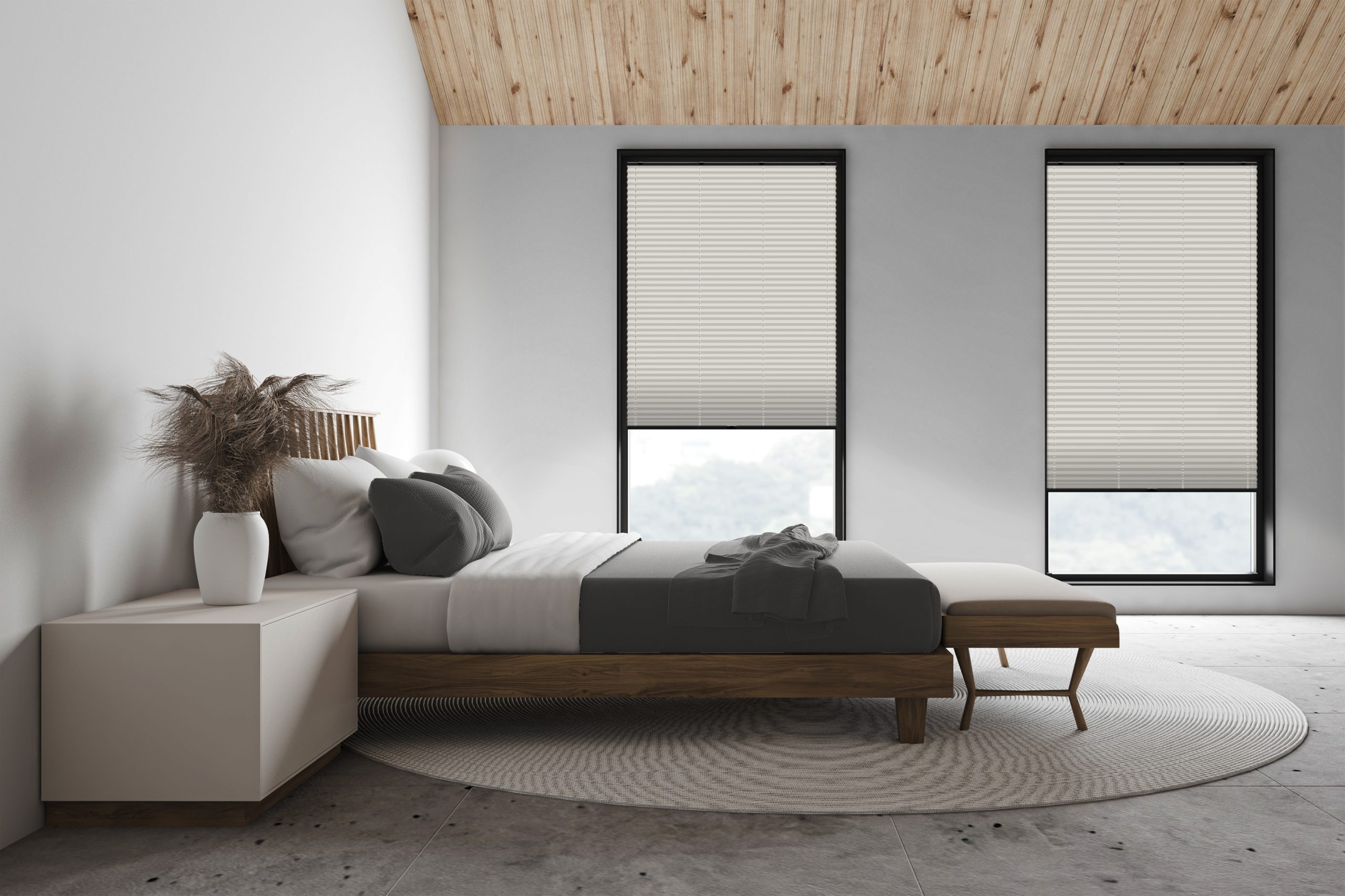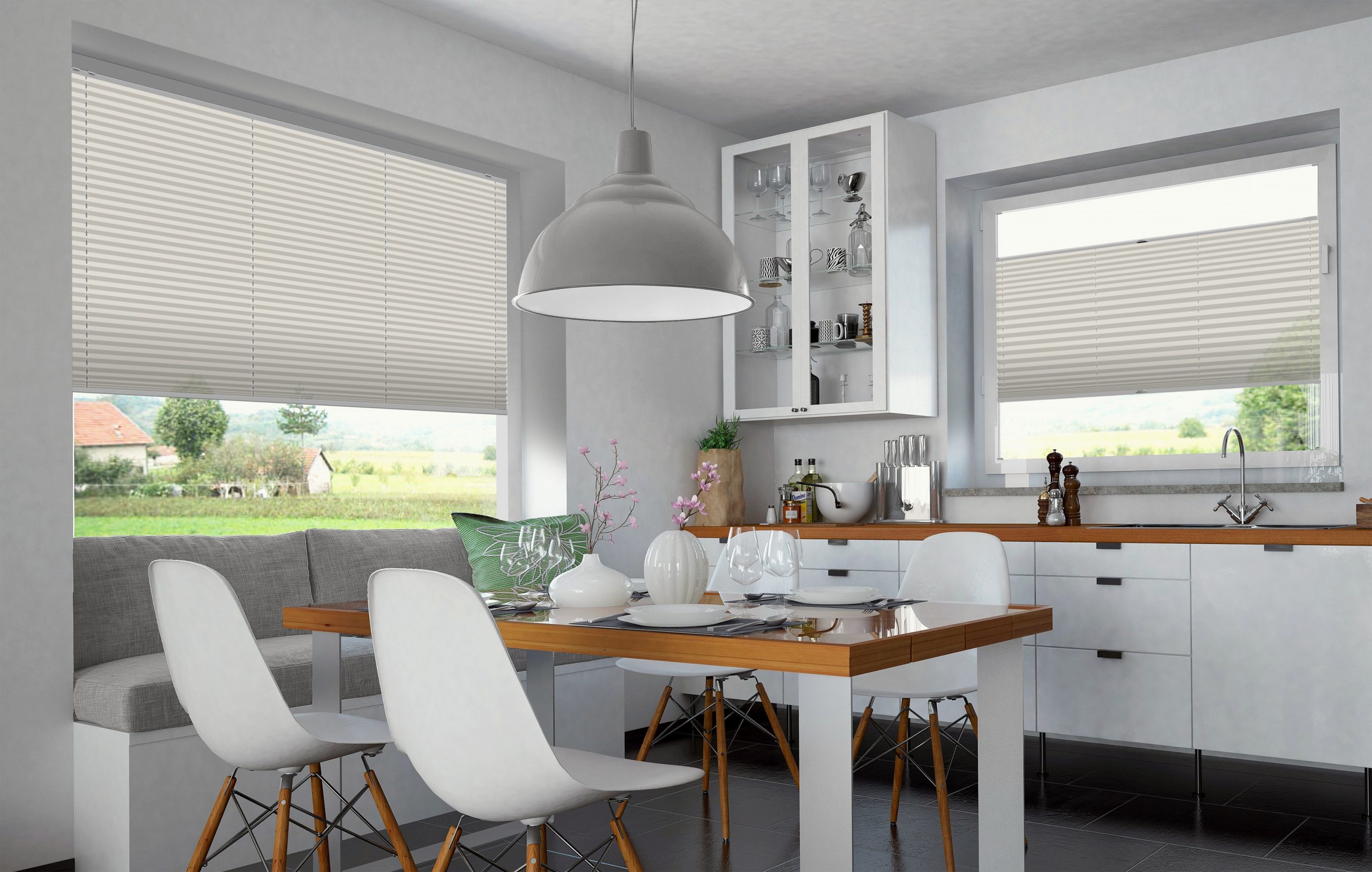 Mit Plissees können Sie jeden beliebigen Teil des Fensters sowohl von oben als auch von unten abdecken. Sehr praktisch, wenn sich der Lauf der Sonne tagsüber ändert oder Sie sich vor neugierigen Blicken schützen wollen. Im hochgezogenen Zustand nehmen Plissees kaum Platz im Fenster ein, sodass Sie bei Bedarf viel Sonnenlicht in Ihre Räume lassen können.