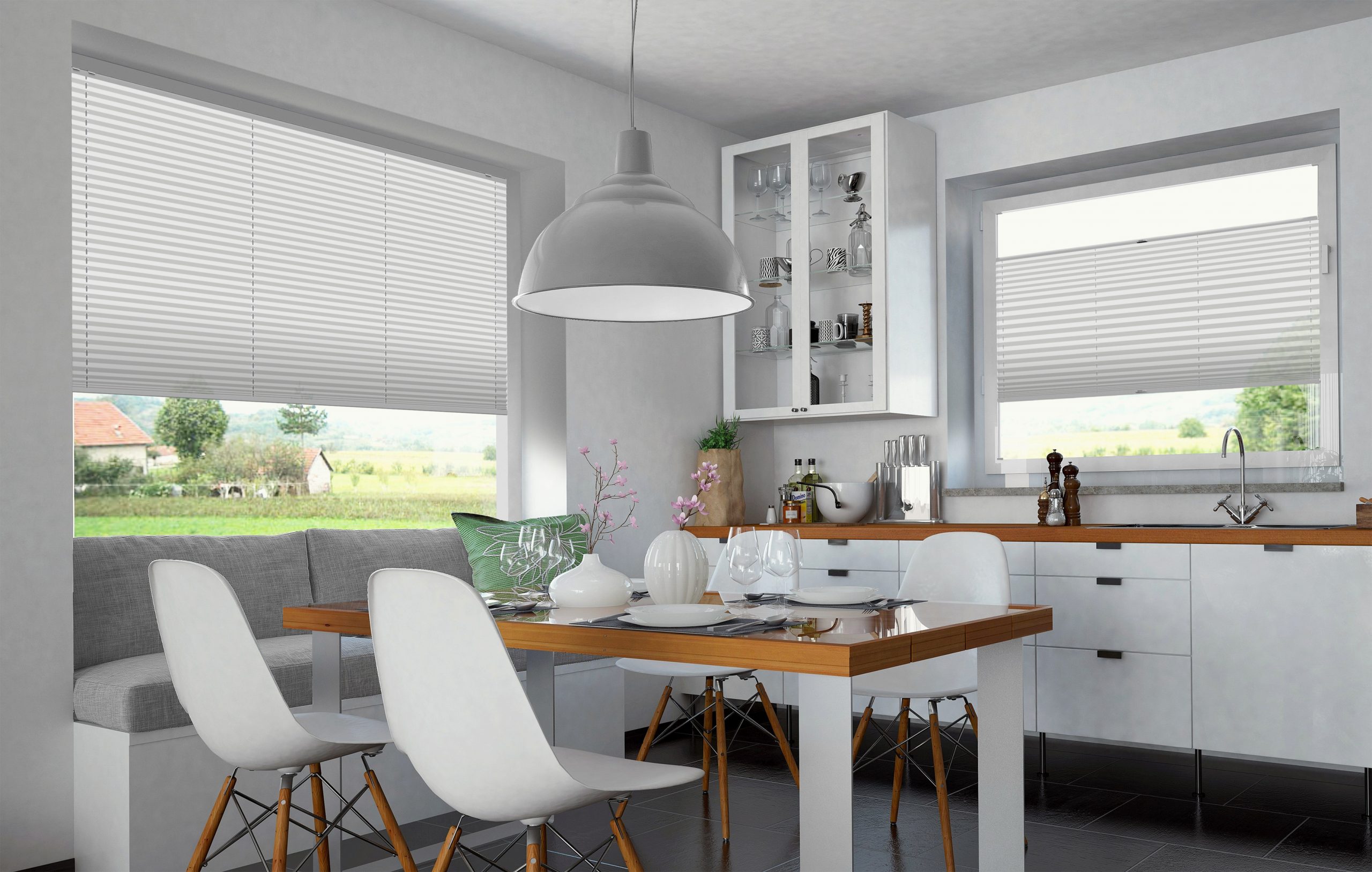 Mit Plissees können Sie jeden beliebigen Teil des Fensters sowohl von oben als auch von unten abdecken. Sehr praktisch, wenn sich der Lauf der Sonne tagsüber ändert oder Sie sich vor neugierigen Blicken schützen wollen. Im hochgezogenen Zustand nehmen Plissees kaum Platz im Fenster ein, sodass Sie bei Bedarf viel Sonnenlicht in Ihre Räume lassen können.